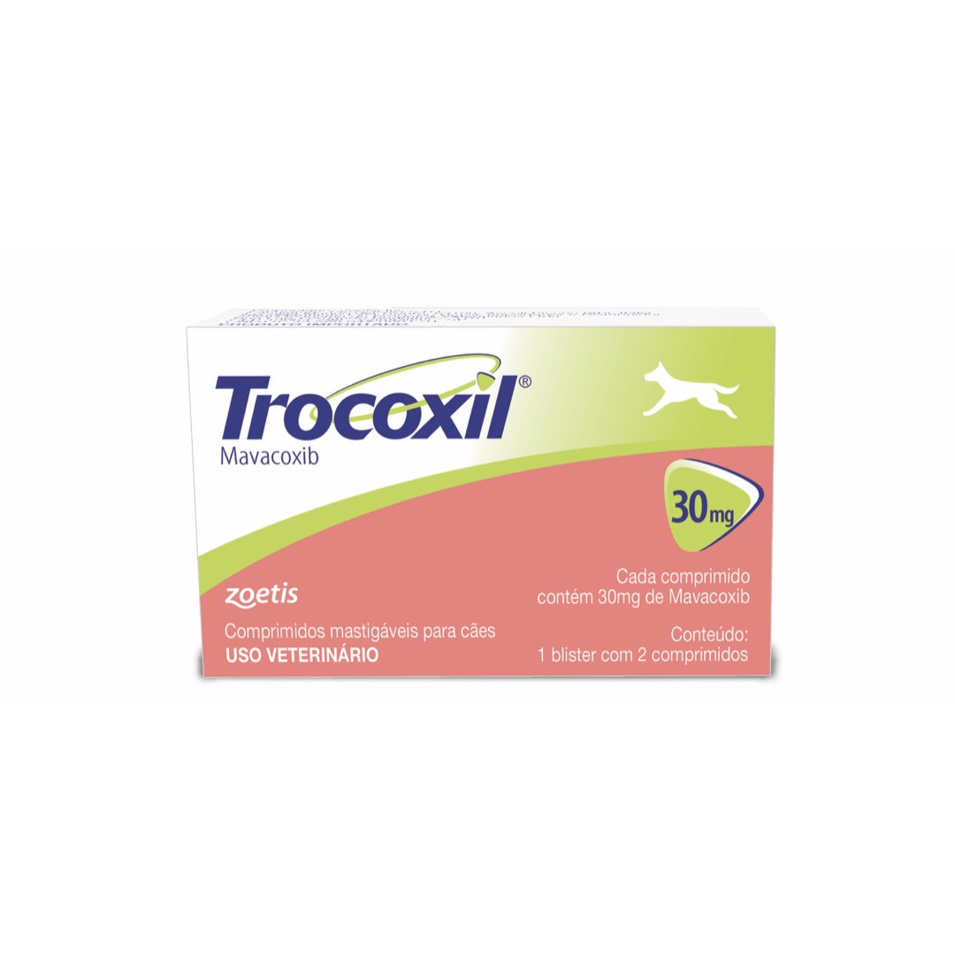 Trocoxil é um anti-inflamatório não-esteroidal usado para tratar dor e inflamação. É indicado no tratamento de dor e inflamação associados à doença articular degenerativa em cães, quando necessário tratamento por mais de um mês. Fórmula: Cada 100mg contém: Mavacoxib - 5mg Excipientes - 100mg