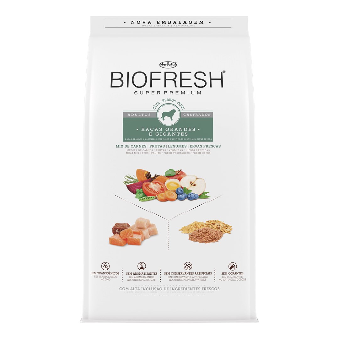 Biofresh Super Premium é inovador e diferente porque possui alta inclusão de ingredientes frescos, diretamente da natureza l O resultado é um alimento completo e equilibrado que se destaca por elevar a nutrição dos cães de raças grandes e gigantes ao seu mais alto patamar l A TECNOLOGIA Biofresh garante a preservação deste alimento de forma segura e 100% natural, SEM ADIÇÃO DE CONSERVANTES ARTIFICIAIS.